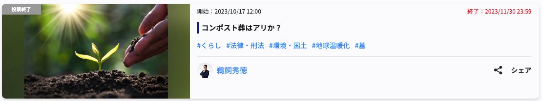 SNSとテクノロジーで社会課題の発見・解決をサポートするPolimill株式会社(ポリミル、本社:東京都港区、代表取締役:横田えり、以下Polimill社)はこのたび、「コンポスト葬はアリか?」というイシュー(課題)について11月30日に投票が終了しましたので結果をお知らせします。