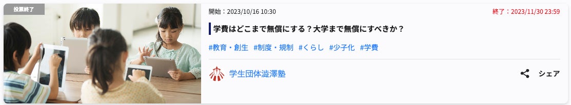 SNSとテクノロジーで社会課題の発見・解決をサポートするPolimill株式会社(ポリミル、本社:東京都港区、代表取締役:横田えり、以下Polimill社)はこのたび、「学費はどこまで無償にする?大学まで無償にすべきか?」というイシュー(課題)について11月30日に投票が終了しましたので結果をお知らせします。
