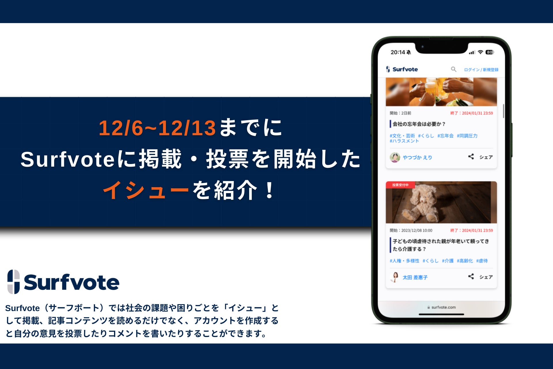 社会におけるさまざまな課題や困りごとをSurfvoteにイシューとして掲載し、イシューは週におよそ3〜5件発行されています。どなたでもすべてのイシューを読むことができますが、アカウント登録をすると各イシューに投票したりコメントを書いたりできるようになります。Surfvoteで集めたみんなの意見や結果は、適宜提言書などに取り纏め、関係省庁や政治家、関連団体に提出しています。https://surfvote.com/