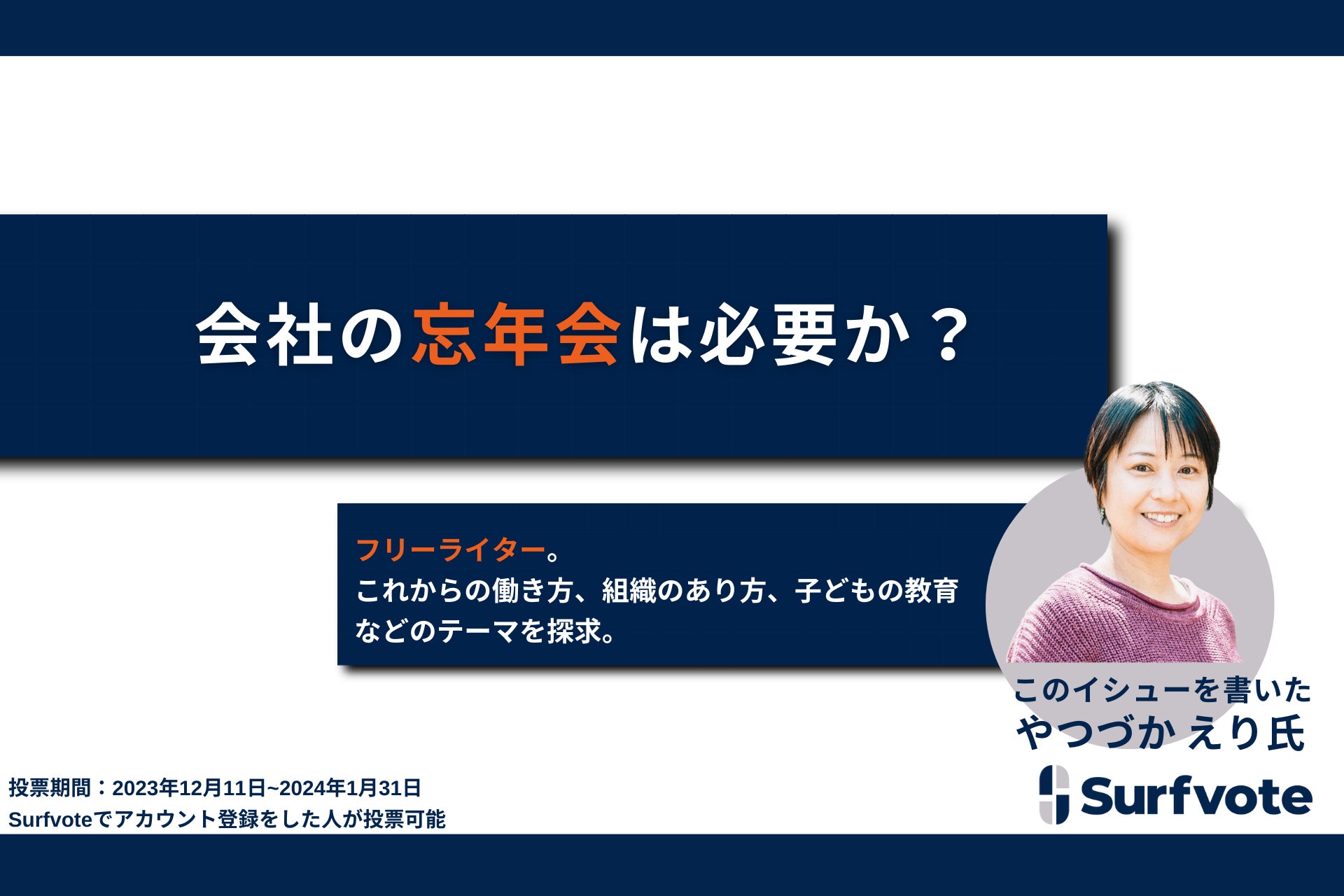 しかし現代では「パワハラ・セクハラの温床」「業務外まで上司に気を遣いたくない」といった声もあり、コロナ禍も相まって忘年会を負担に感じる社員もいます。この「忘年会」文化は今後も続けていくことが望ましいのか?意見をひろく集めます。https://surfvote.com/issues/iwvhyhq1p1ba