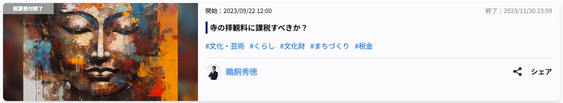 SNSとテクノロジーで社会課題の発見・解決をサポートするPolimill株式会社(ポリミル、本社:東京都港区、代表取締役:横田えり、以下Polimill社)はこのたび、「寺の拝観料に課税すべきか?」というイシュー(課題)について11月30日に投票が終了しましたので結果をお知らせします。