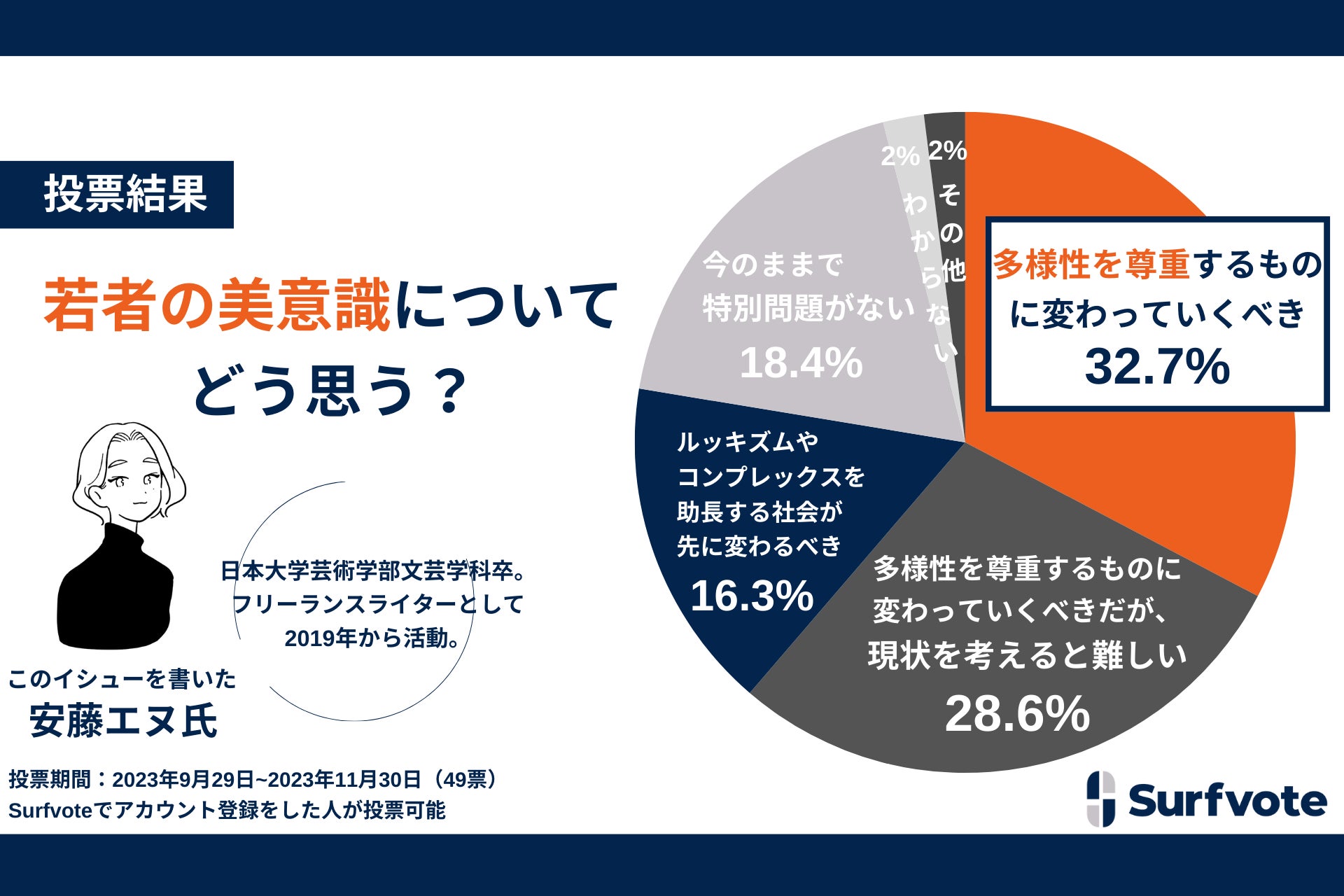 昨今の中高生は、容姿に対するこだわりの強さと、半ば強迫観念的な「美」に対する執着が強いと安藤氏は指摘する。多様性が尊重されるようになった社会の中で、美的観念の在り方にも変化がもたらされるようになり、ありのままが美しい、自分らしくいることが美しいと提唱するインフルエンサーやモデル、俳優などの有名人が彼らに影響を与えている一方で、なお強く存在し続ける「美しくなければならない」「見目が良くないと他者から肯定されない」という考えもある。若者たち(特に10代)が抱える美意識について率直にどう感じるか?Surfvoteを通じて、皆さんの意見を幅広く募集した。