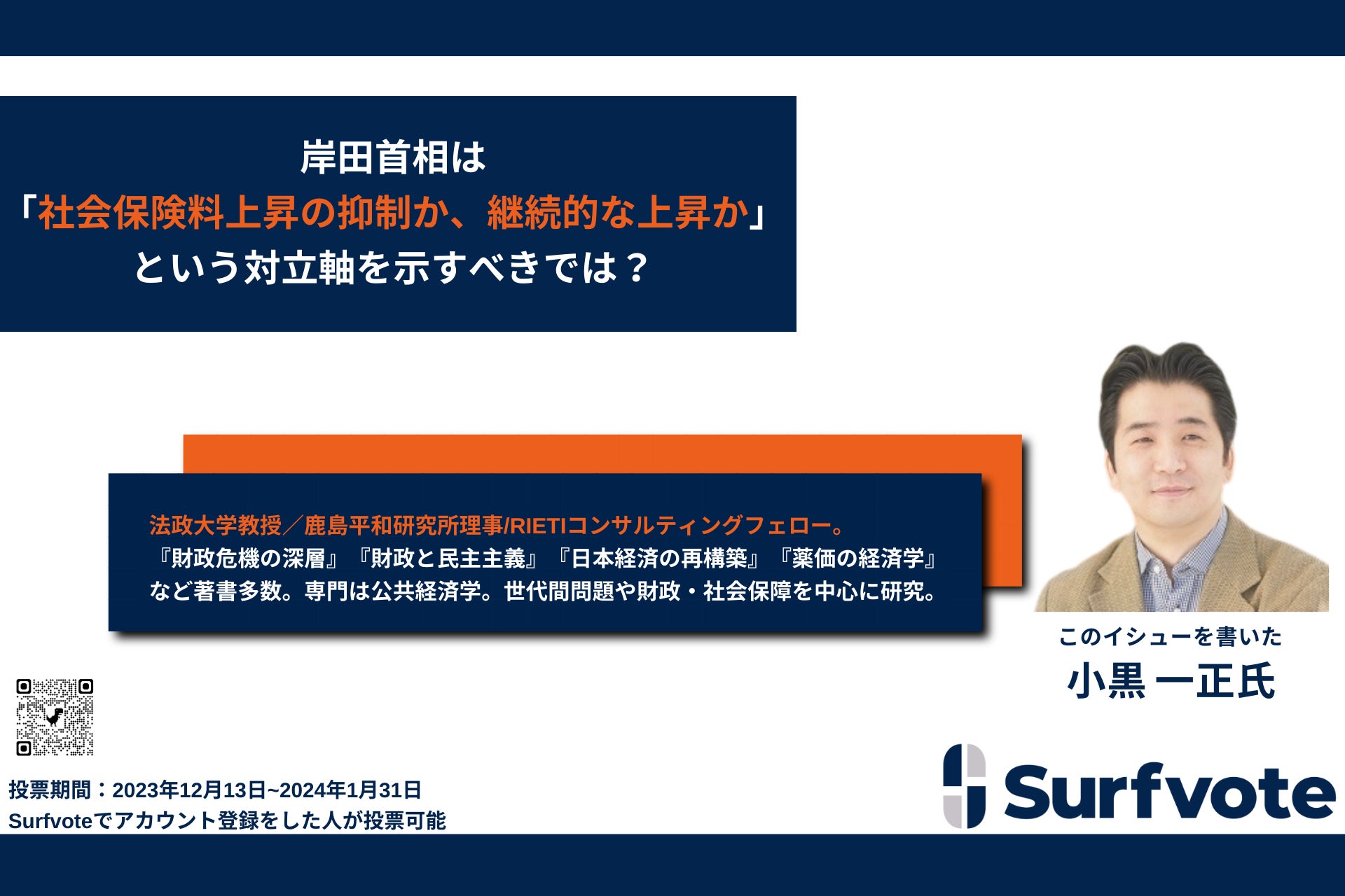 社会保険料の国民負担率が上昇するなか、いくら賃上げが実現してもそれ以上に社会保険料が増加すれば家計の手取りが減少し、国民生活が一層厳しいものになります。この状況を踏まえ、「岸田首相は『社会保険料上昇の抑制か、継続的な上昇か』という対立軸を総選挙で示すべきではないか?』という意見のもと、Surfvoteでひろく意見を集めます。