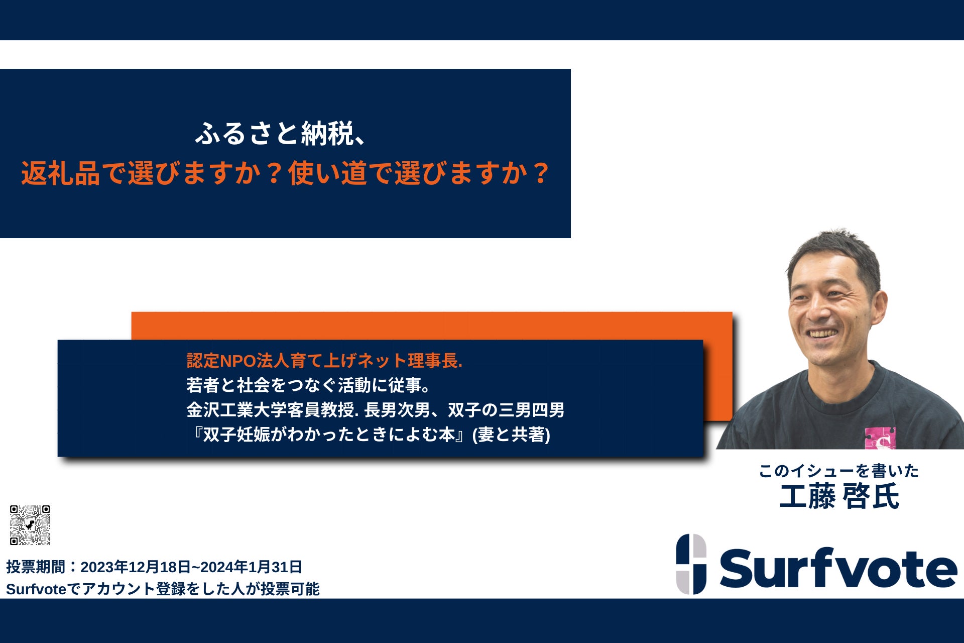 毎年12月は「駆け込みふるさと納税」が急増する時期、ふるさと納税利用者のおよそ8割が12月に集中すると言われています。2022年度のデータでは、受け入れ金額は約9654億円と、一兆円に迫る勢いになっています。各自治体も魅力的な返礼品をラインナップ、普段はなかなか手を出しづらい高級食材などが特に人気です。なにかと「返礼品」ばかりが注目されがちなふるさと納税ですが、昨今注目を浴びているのが「使い道」で選んで寄付をする、ガバメントクラウドファウンディングです。自治体が抱える課題と解決策を提示し、ふるさと納税で寄付を募る仕組み。芸術文化を守る、産業復興や動物愛護など「使い道」は多様化しています。これらを踏まえ、ふるさと納税は「返礼品」で選ぶか?「使い道」で選ぶか?Surfvoteでひろく意見を集めます。