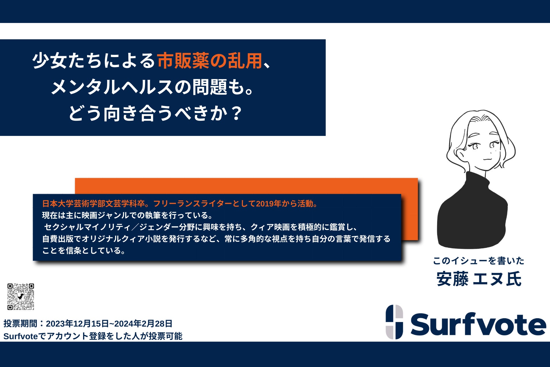 昨今、市販薬によるOD(オーバードーズ=多量摂取)が問題となっており、特に若年層が乱用しているケースが目立ちます。今年9月には新宿歌舞伎町の「トー横」で無許可で市販薬を販売していた16歳の女子高生が逮捕、12月には東京目黒区の小学校で児童2人が市販薬を過剰に摂取し救急搬送、すぐ翌日には足立区で大量の市販薬を摂取したと見られる女性が意識不明の状態で緊急搬送されました。ODの原因として、鬱屈とした心を晴らすために薬物に頼ってしまう、つまりメンタルヘルスの問題に直結していると安藤氏は指摘します。市販薬はドラッグストアで安易に手に入る一方で、乱用すれば死に至るほどの危険もはらんでいます。このオーバードーズ問題について、大人や社会はどのように向き合っていくことが望ましいのか?Surfvoteでひろく意見を集めます。