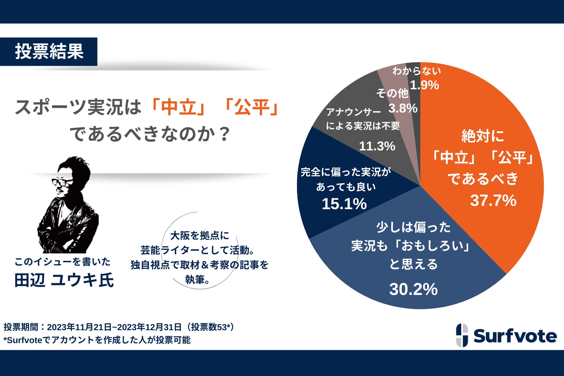 大阪を拠点に芸能ライターとして活動する田辺ユウキ氏が「社会課題を解決するプラットフォーム『Surfvote』」でスポーツ実況の中立性についてとい、投票結果を公開!