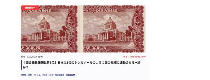 SNSとテクノロジーで社会課題の発見・解決をサポートするICTスタートアップのPolimill株式会社(ポリミル、本社:東京都港区、代表取締役:横田えり、以下Polimill社)は自社SNS【Surfvote】上で、「【国会議員報酬世界3位】日本は1位のシンガポールのように国の指標に連動させるべきか?」というテーマで意見投票を開始しました。(投票〆切:2023年3月31日)投票はこちらから https://surfvote.com/issues/dtedkz9i9h7