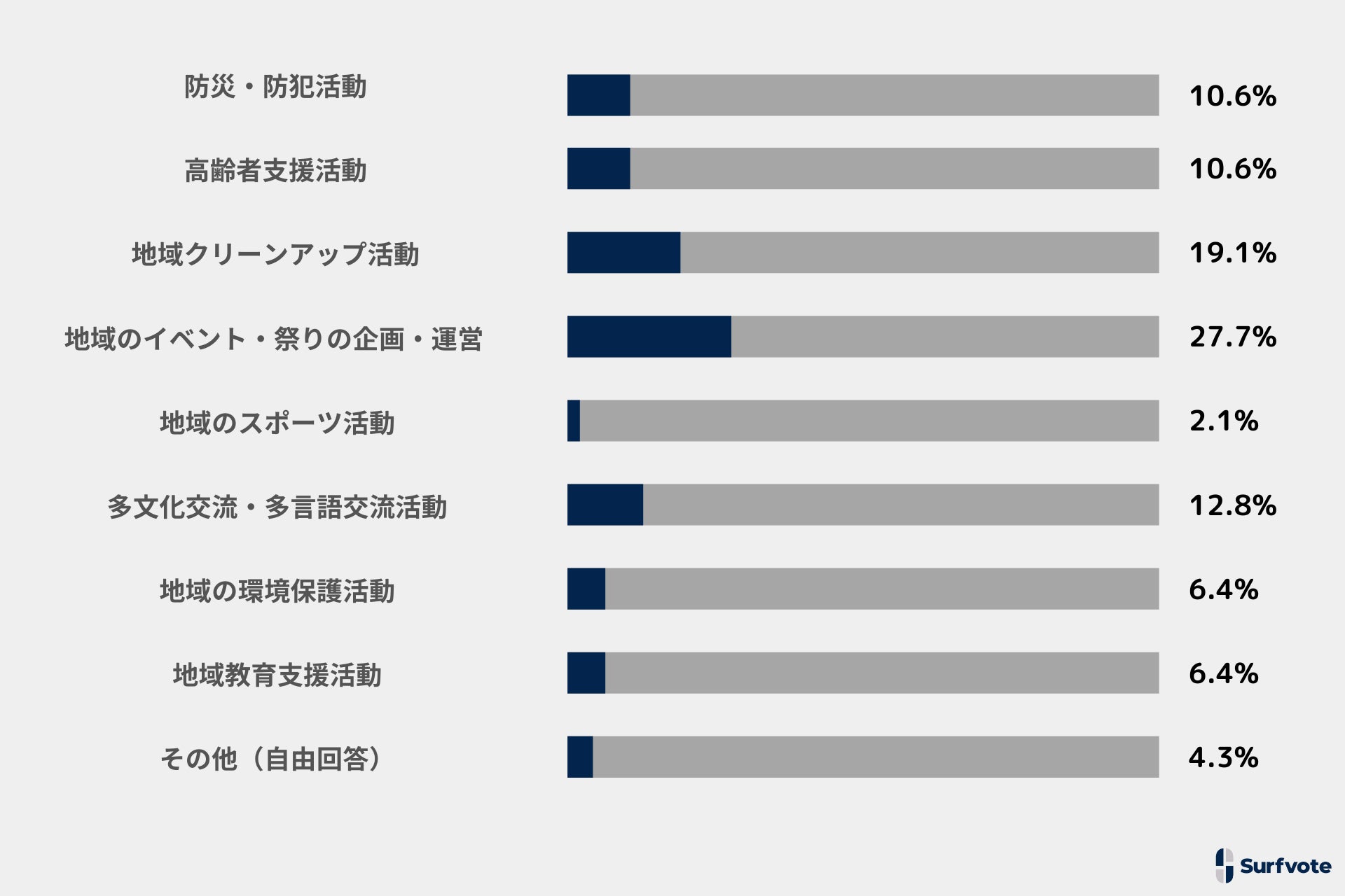 「地域のイベント・祭りの企画・運営」27.7%で最多。次いで「地域クリーンアップ活動」が19.1%、「多文化交流・多言語交流活動」が12.8%。