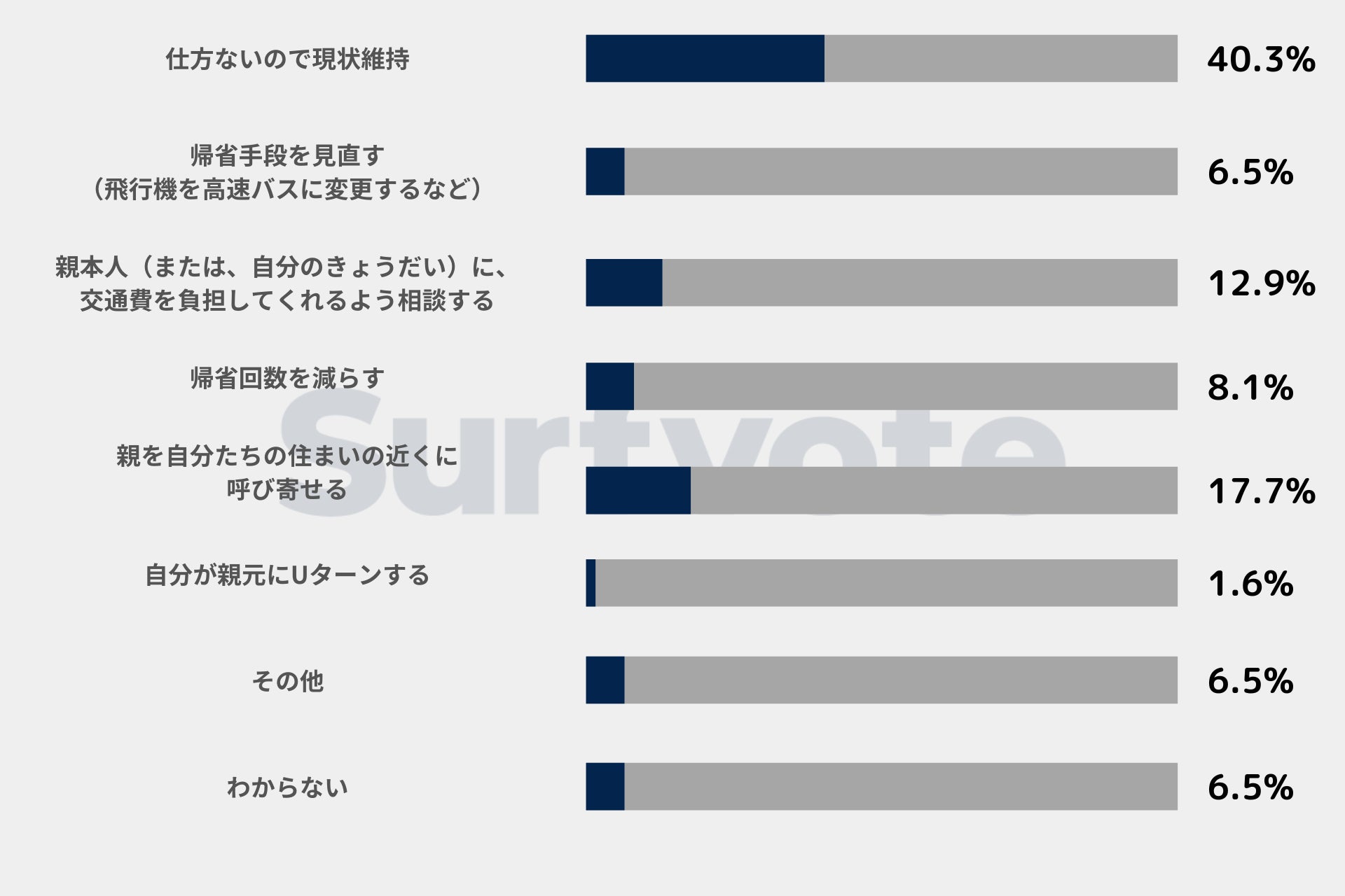 親の遠距離介護、家計破綻しないためにできること。最も多かった回答は「仕方ないので現状維持」が40.3%。次いで「親を自分たちの住まいの近くに呼び寄せる」が17.7%。