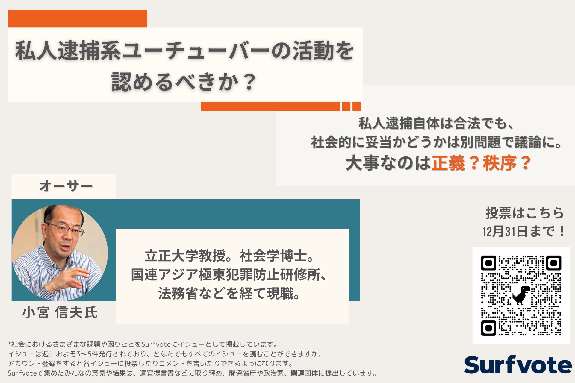 SNSとテクノロジーで社会課題の発見・解決をサポートするPolimill株式会社(ポリミル、本社:東京都港区、代表取締役:横田えり、以下Polimill社)はこのたび、イシュー「私人逮捕系ユーチューバーの活動を認めるべきか?」について、11月14日にSurfvoteへ掲載、一般ユーザーの意見投票が始まりましたのでお知らせします。